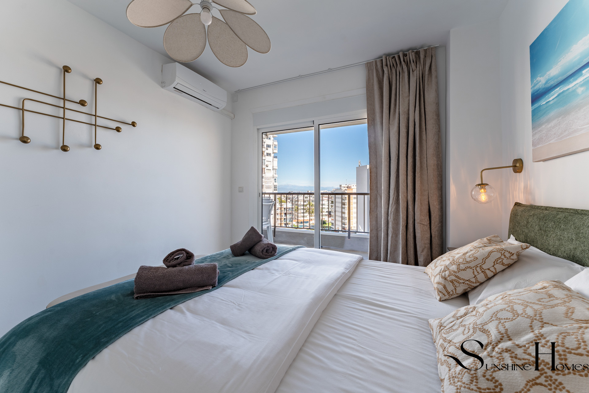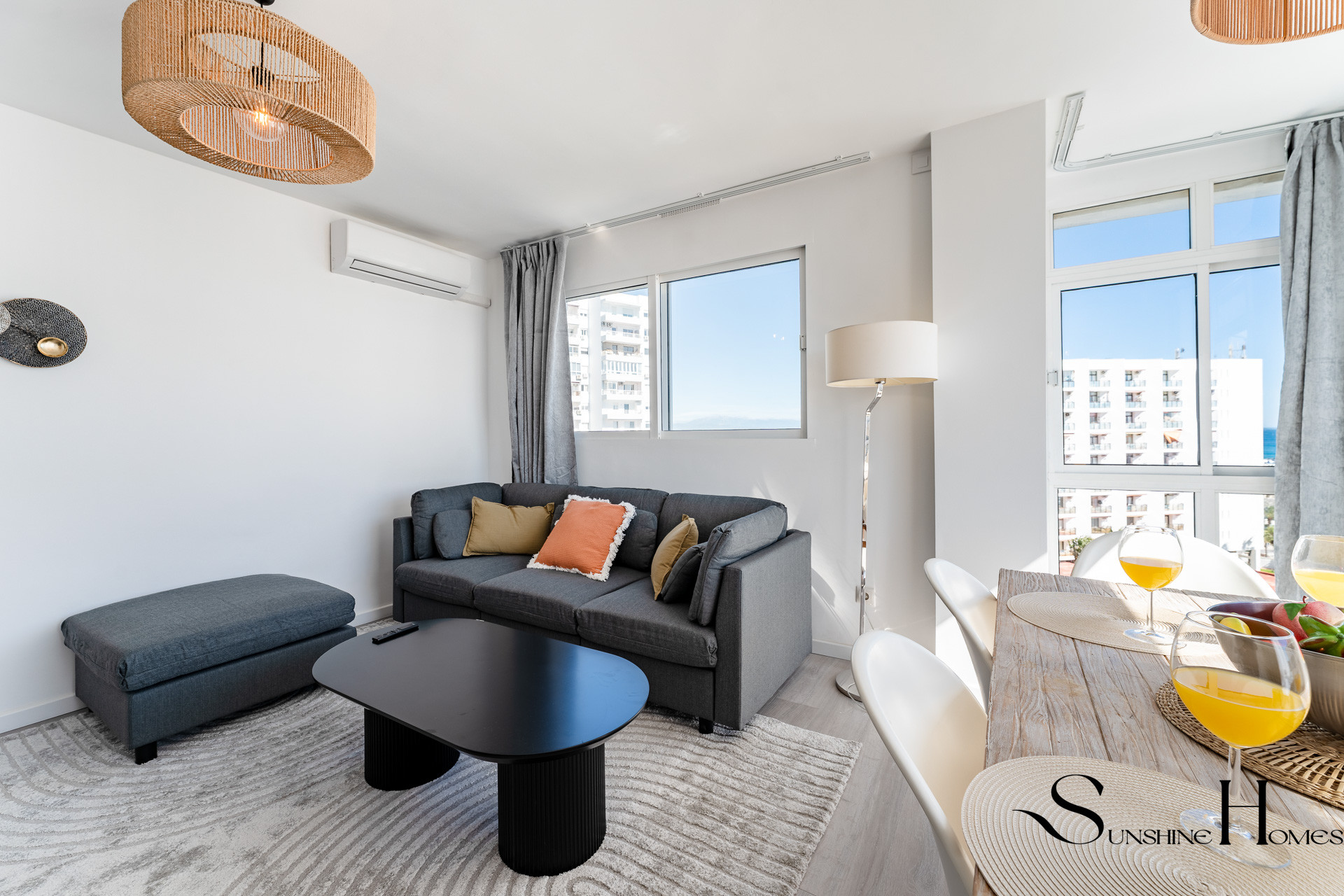 Bienvenido a su escapada costera perfecta en Benalmádena. Este apartamento de 3 dormitorios, renovado con estilo, ubicado en la octava planta, ofrece impresionantes vistas al mar y a la montaña que puede disfrutar desde el balcón privado, ideal para el café de la mañana o copas al atardecer.